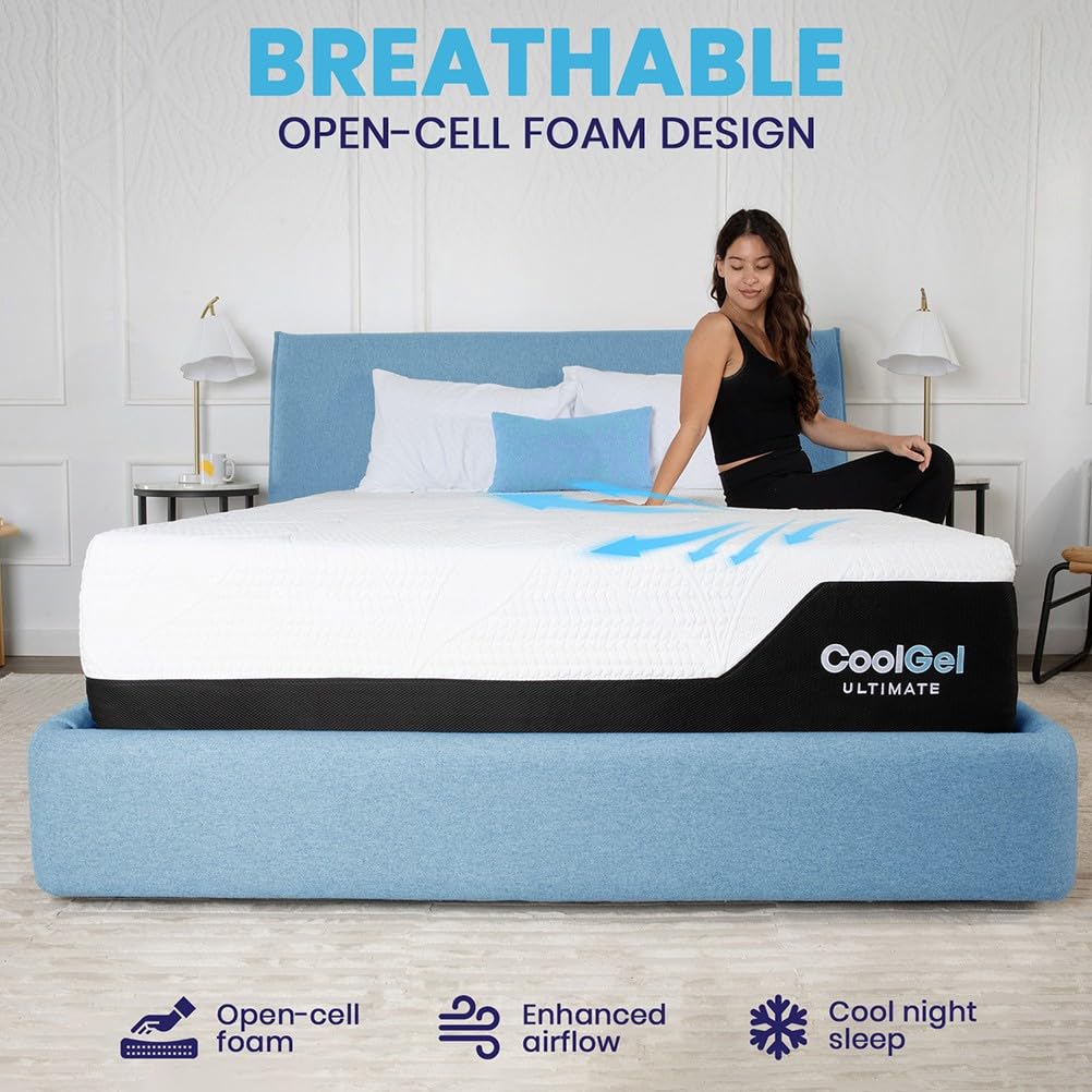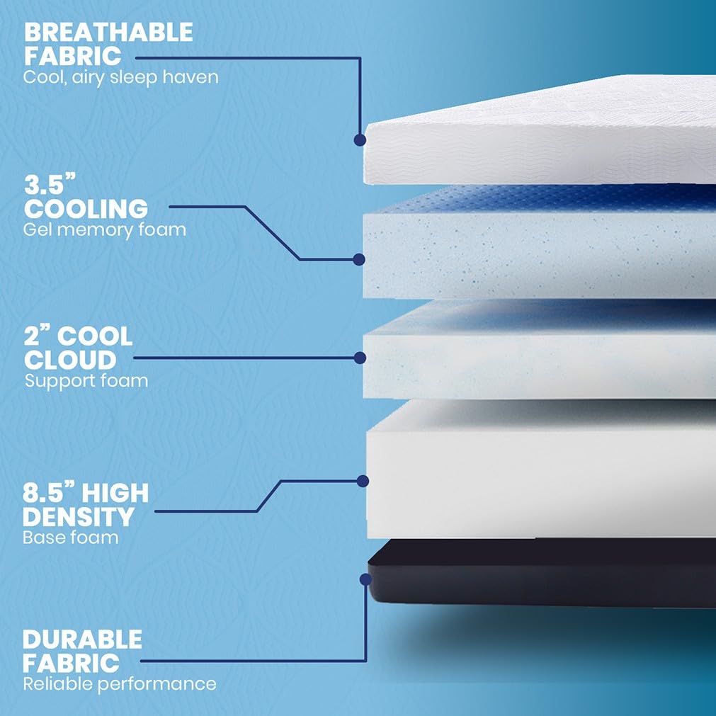 Details: Experience ultimate comfort with the best Cool Gel 14-Inch Medium Firm Queen Memory Foam Mattress in a box, available on amazon in California King, King, Queen, Full, Twin, and Twin XL sizes. Featuring a luxurious 3.5-inch top layer of ventilated cool gel memory foam, this matress contours to your body’s shape while regulating temperature for a cooler, undisturbed sleep. This queen mattress features high-density memory foam which provides essential pressure relief, supporting proper spinal alignment and promoting a deeper, more restful night’s sleep. The breathable open-cell structure enhances airflow, keeping you cool and refreshed. This fiberglass-free memory foam mattress queen size meets CertiPUR-US standards for durability, performance, and emissions, ensuring a safe and healthy sleep environment. Enjoy added value with 2 bonus memory foam pillows (1 pillow included with Twin Mattress and Twin XL sizes) for superior neck and head support. Simple to set up – just unbox and let it expand naturally. Available Callifornia King Bed Mattress, King Bed Mattresses, Bed Queen Size Mattress, Full Mattress, Twin Bed Mattress, and Twin XL. Colchones de espuma queen. cali king, king mattress, full size, twin, and twin xl. CoolGel Mattress Memory Foam for the entire family, from twin size to cali king size.