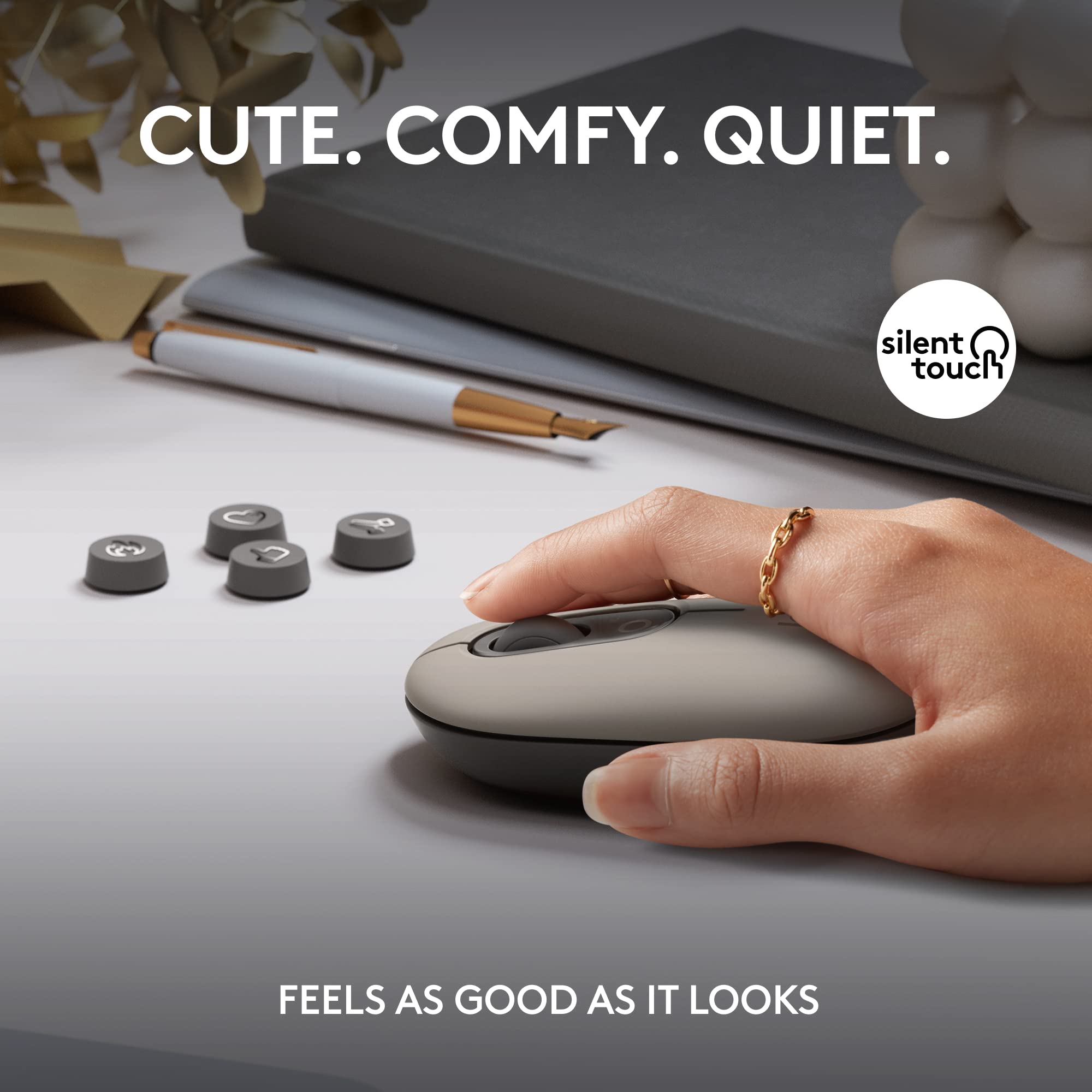 - Less is more: Soft grey and natural sand colors kiss on an elegant, minimalist palette, allowing you to make an understated impact with POP Silent Mouse in Mist