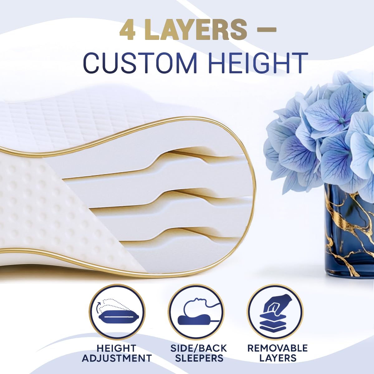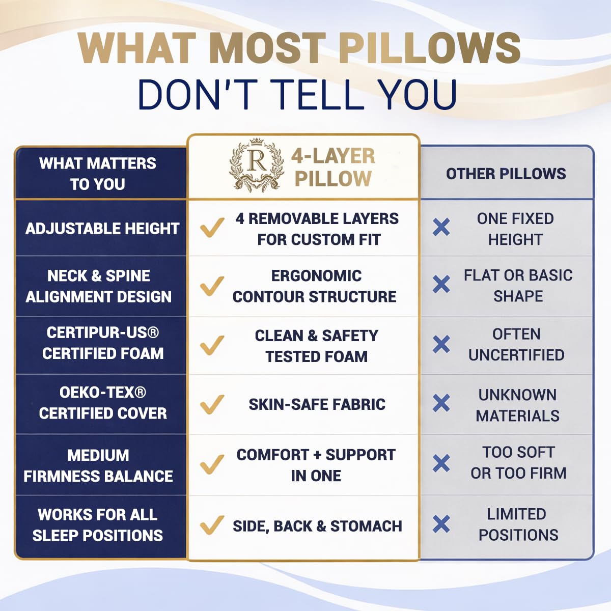 - 4-LAYER ADJUSTABLE QUEEN-SIZE, MEMORY FOAM PILLOW, – Royal Therapy snuggle bed pillows are designed to contour to the unique shape of the body to help support your head and neck. It provides even support for the neck and head. This Rayon Made from Bamboo pillow allows for uniform pressure on all areas of the head and neck. By removing the middle foam layer, its construction allows it to be perfect for all kinds of sleepers (side / back / stomach).