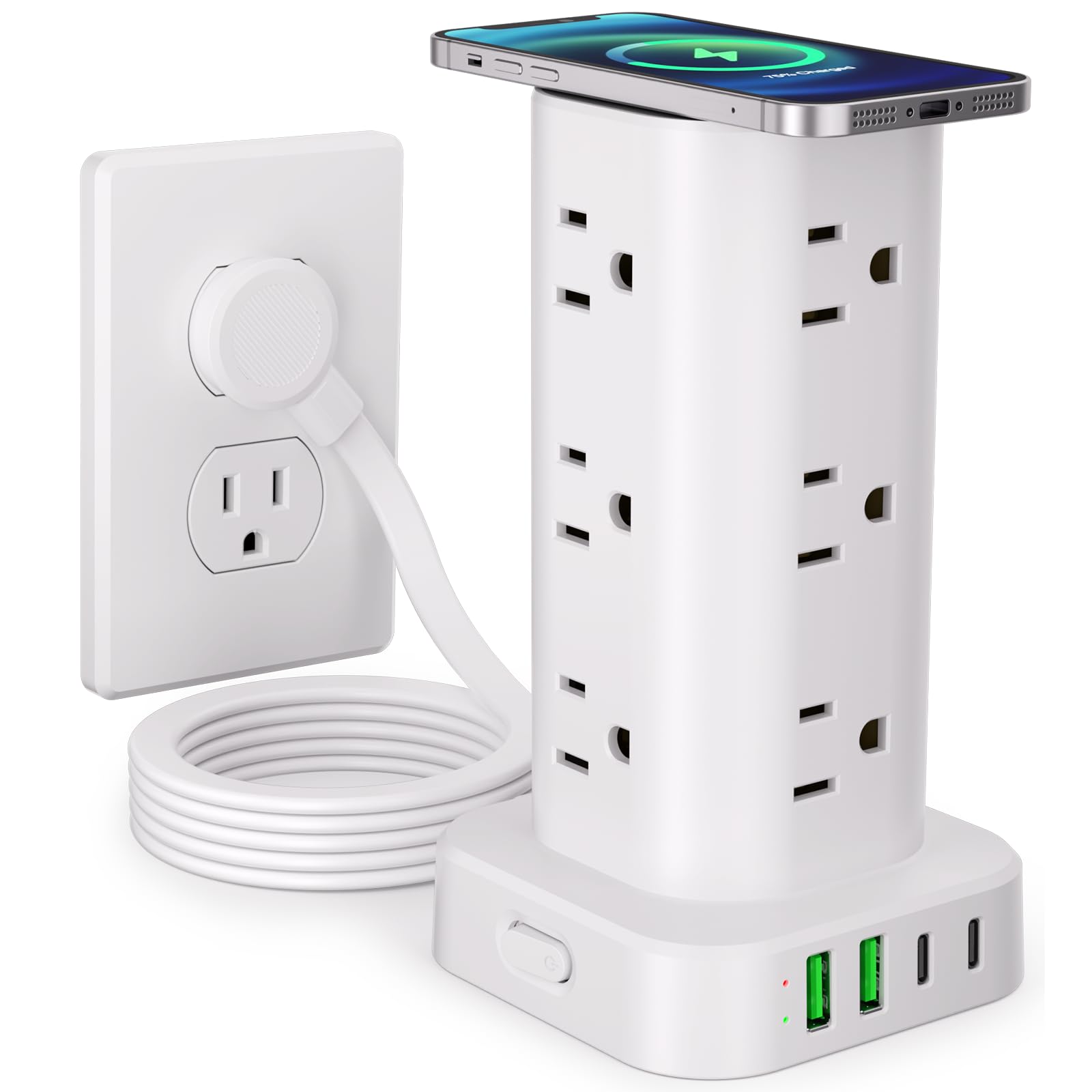 - 17 in 1 Power Strip Tower with USB: This surge protector power strip tower extends one socket to multiple outlets –one wireless charger, 12 AC outlets and 4 smart USB ports (2 USB-A and 2 USB-C). Charge up to 17 devices simultaneously, keeping your desktop organized. Turns a single socket into a versatile multiport charging station, perfect for your home, office, or dorm room