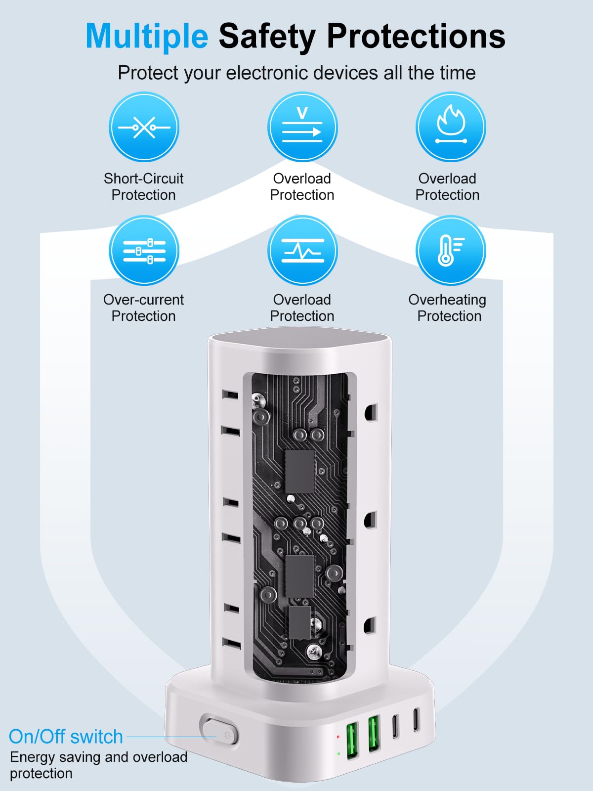 - Surge Protection & Overload Protection: This power strip tower features an 1800J surge protector with overload, short-circuit, and over-current protection. The reset/off switch helps you save energy on the go. In case of overload, it shuts off automatically to keep your precious devices safe. Safeguard your gadgets and enjoy a reliable charging environment