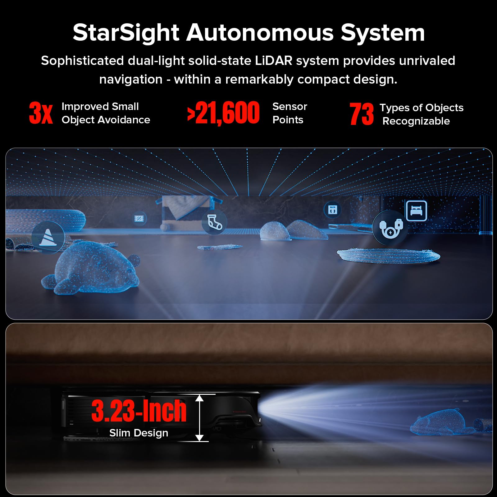 • StarSight Dual Light Solid-State LiDAR – As Roborock’s latest innovation, the system provides a comprehensive 3D understanding of the surroundings, enabling precise navigation with pinpoint precision and accurate mapping, even in challenging areas, such as under suspended cabinets and around thin-legged furniture. Powered by 3D sensors that capture precise outlines of obstacles and an RGB camera for visual recognition, Roborock Qrevo Slim swiftly recognizes and evades 73 types of objects