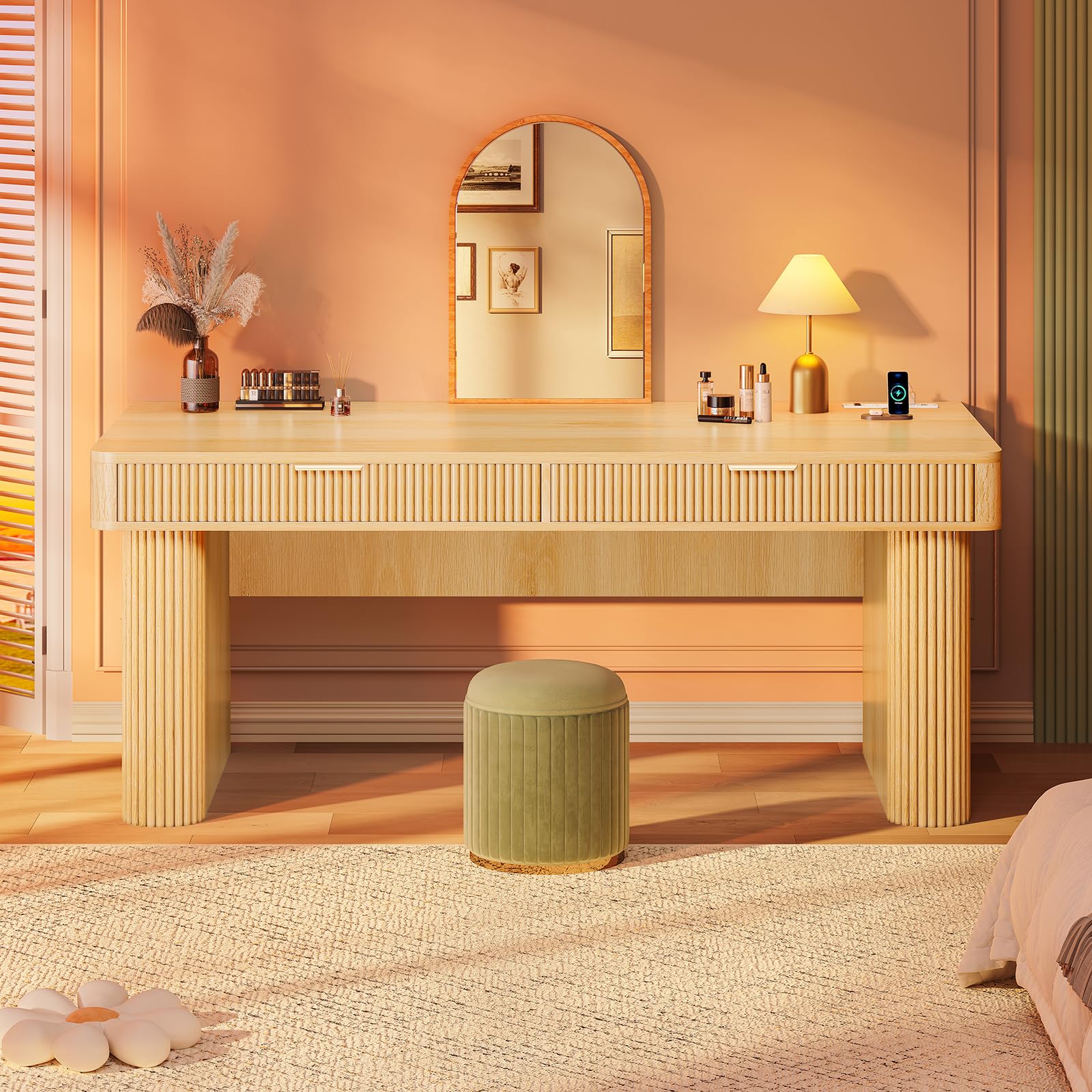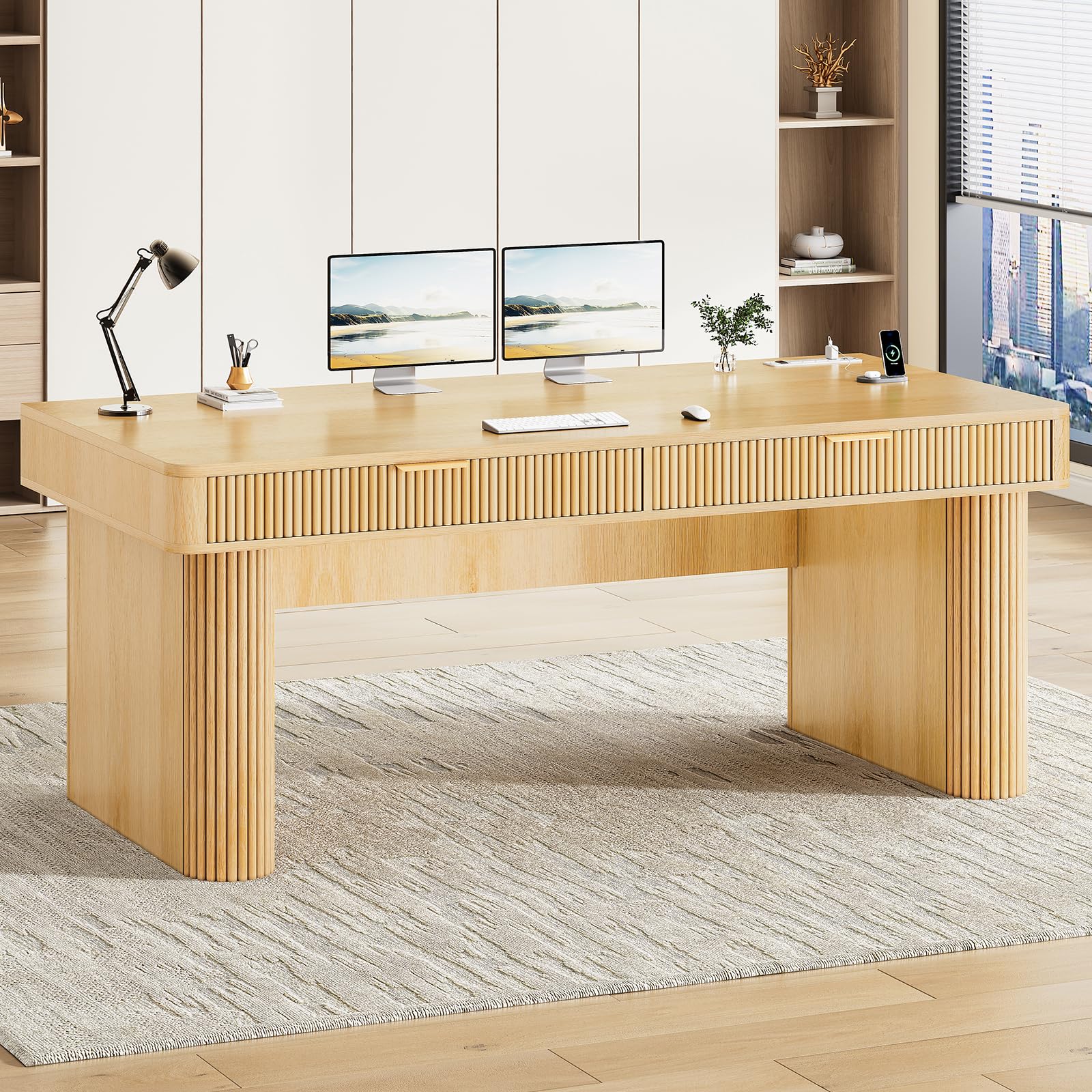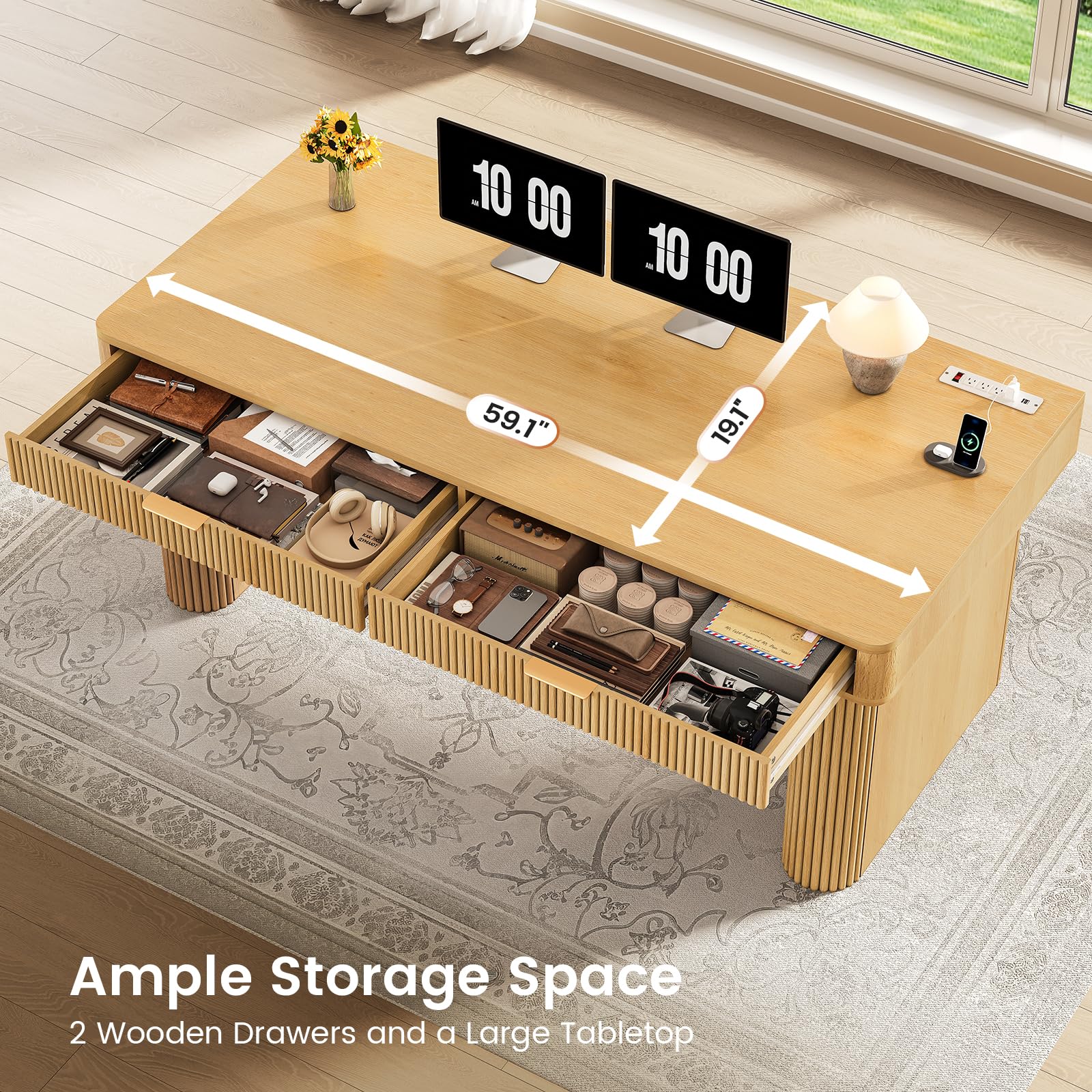 SEDETA Office Desk with 2 Drawers, 59″ Fluted Computer Desk with Storage and Power Strip, Wood Executive Desk, Writing Desk for Home Office, Living Room, Bedroom, Oak