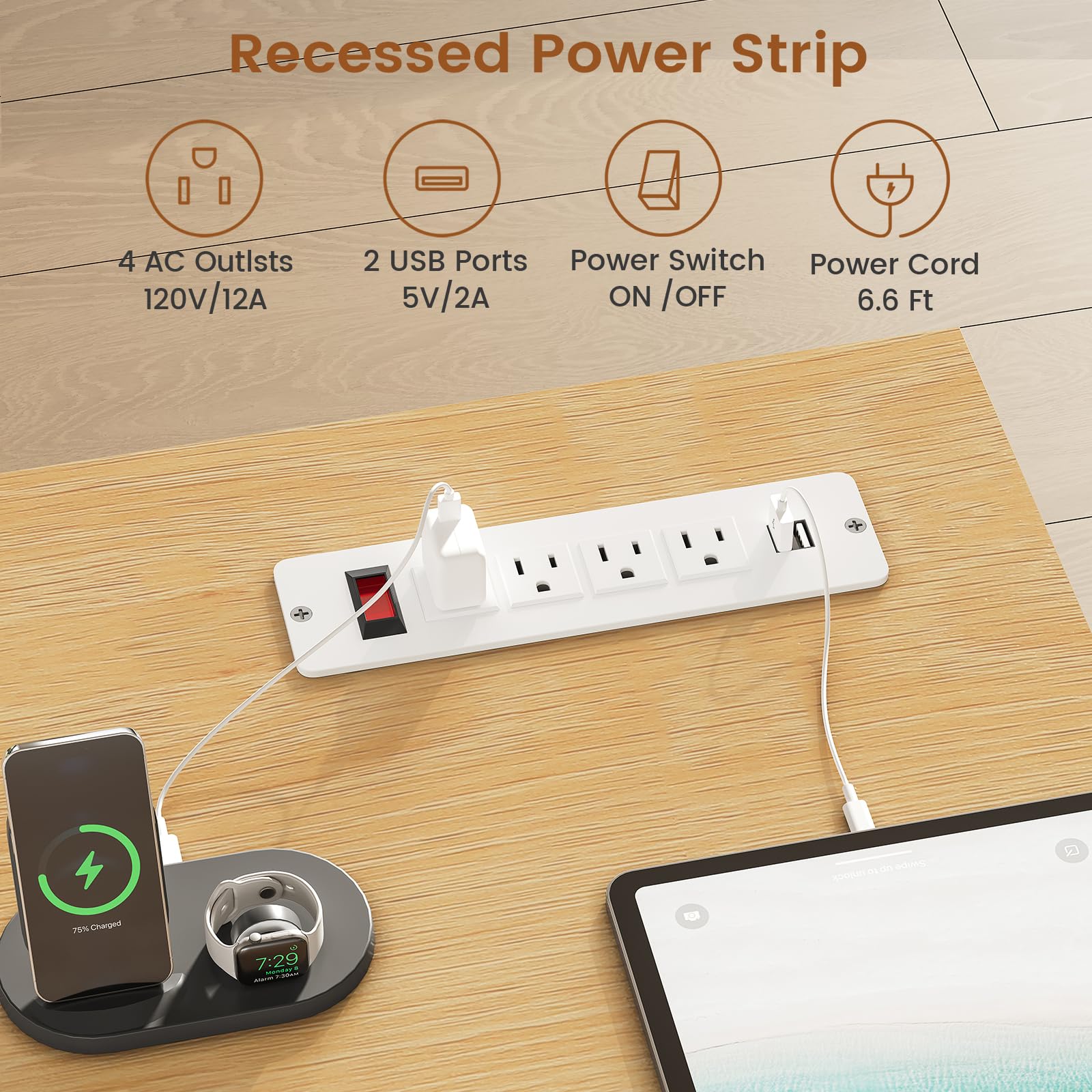 • 【Built-in Charging Station】Equipped with a recessed power strip including 4 AC outlets, 2 USB ports, and a 6.6 ft cord. It charges phones, laptops, and tablets conveniently, keeping your desk tidy and cable-free.