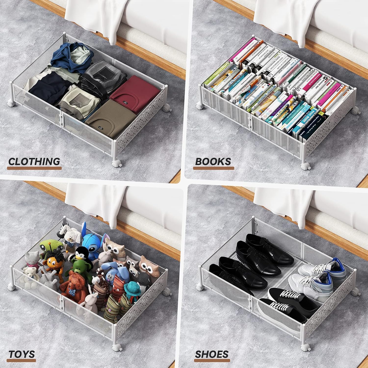 - [Quality Metal Container] Never settle for flimsy plastic&linen under bed storage bins which rip all too easily. This under the bed storage container is completely made of metal, compared with other under bed storage bins, smaller mesh size of the shelf is used for a larger load-bearing capacity. Plus, the whole frame was welded into a whole that never falls apart.