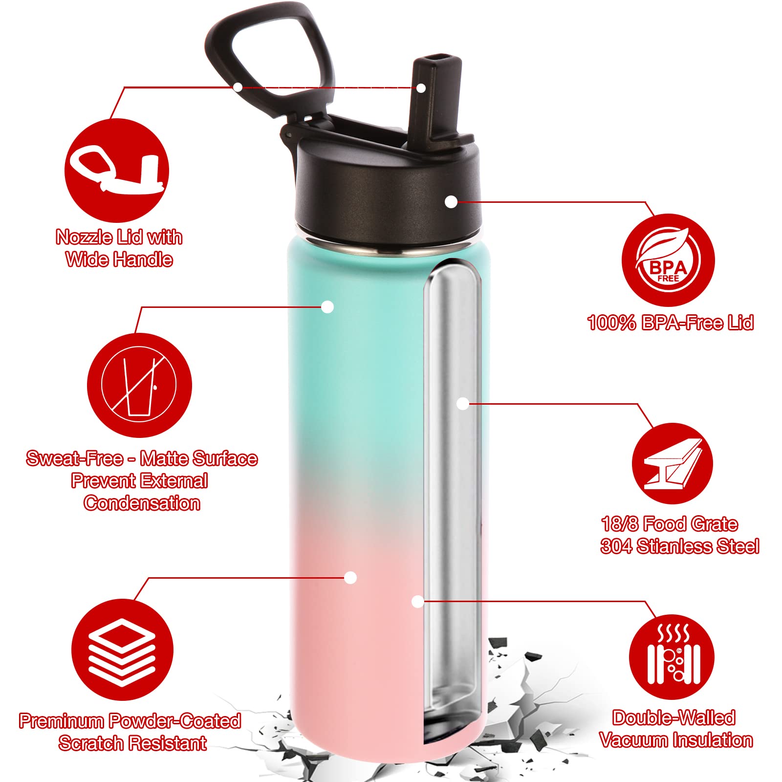 - 【Premium Material】Constructed of 18/8 food grade stainless steel, durable and unbreakable. All components are non toxic, Lead Free, BPA free and environmentally friendly. Electro polished inside, highly resistant to rust. Giving you a clean tasting drink every time, Premium Powder coating offers a steady grip without slipping from sweaty palms and will not fade or fall off