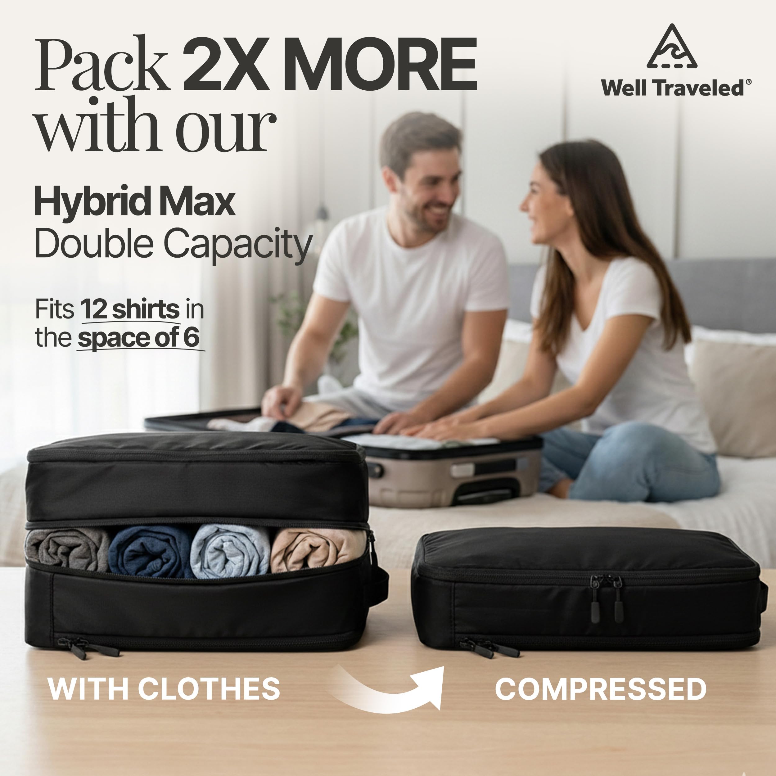 • MAXIMIZE LUGGAGE SPACE. Pack 2X more with HybridMax DOUBLE CAPACITY compression packing bags. Fits 12 shirts in the space of 6. Tested by 50,000+ travelers. 8-piece BLACK large packing cubes for travel compression set.
