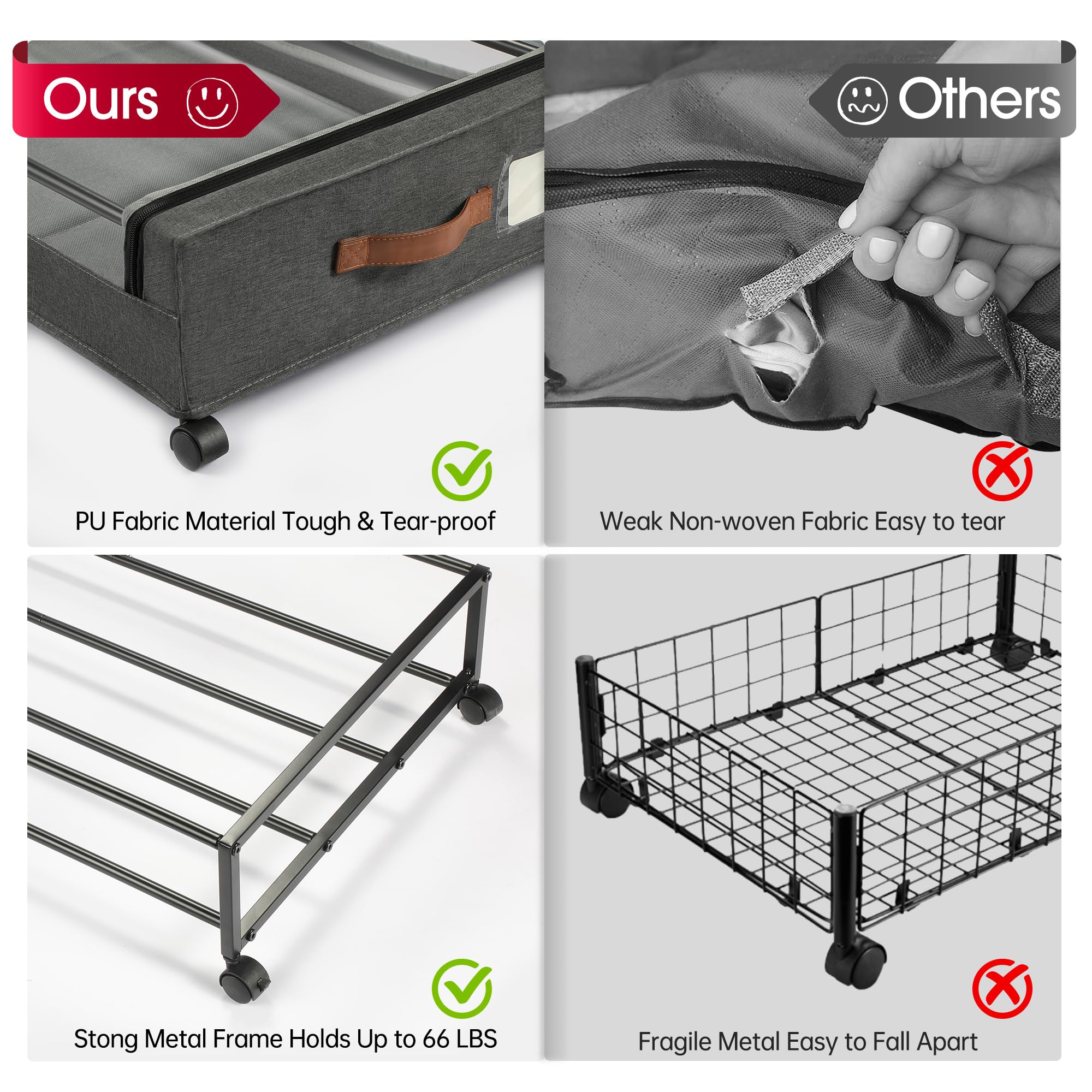 - Hold Up to 66lbs: Yecaye under bed storage with wheels is made of high quality 300D PU fabric and sturdy metal frame, can hold up to 66 lbs, stronger than other fragile metal mesh, spacious capacity perfect for storing clothes, toys, books, shoes and other heavy items also won’t compromise stability and durability